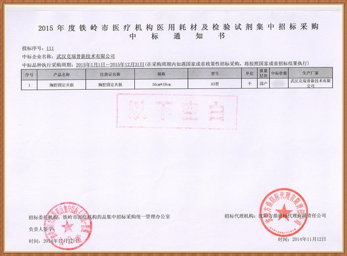 【遼寧省2015年度鐵嶺市醫(yī)療機(jī)構(gòu)醫(yī)用耗材及檢驗(yàn)試劑集中招標(biāo)采購(gòu)中標(biāo)通知書(shū)】我們東科圣康品牌的胸腔固定夾板術(shù)前術(shù)后外固定耗材在2015年度鐵嶺市醫(yī)療機(jī)構(gòu)集中采購(gòu)中已成功中標(biāo),中標(biāo)價(jià)格較為優(yōu)惠產(chǎn)品醫(yī)生操作起來(lái)比較簡(jiǎn)單,而且可以提升接診率,產(chǎn)品輕便舒適等特點(diǎn)。