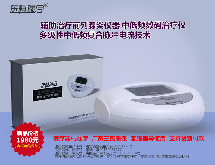 東科瑞寶牌中低頻數(shù)碼治療儀(輔助治療前列腺炎),為國(guó)標(biāo)二類醫(yī)療器械產(chǎn)品,由治療儀主機(jī)、 導(dǎo)電理療電極片、DC導(dǎo)線、前列腺儀器設(shè)備專用固定帶等配件耗材組成。